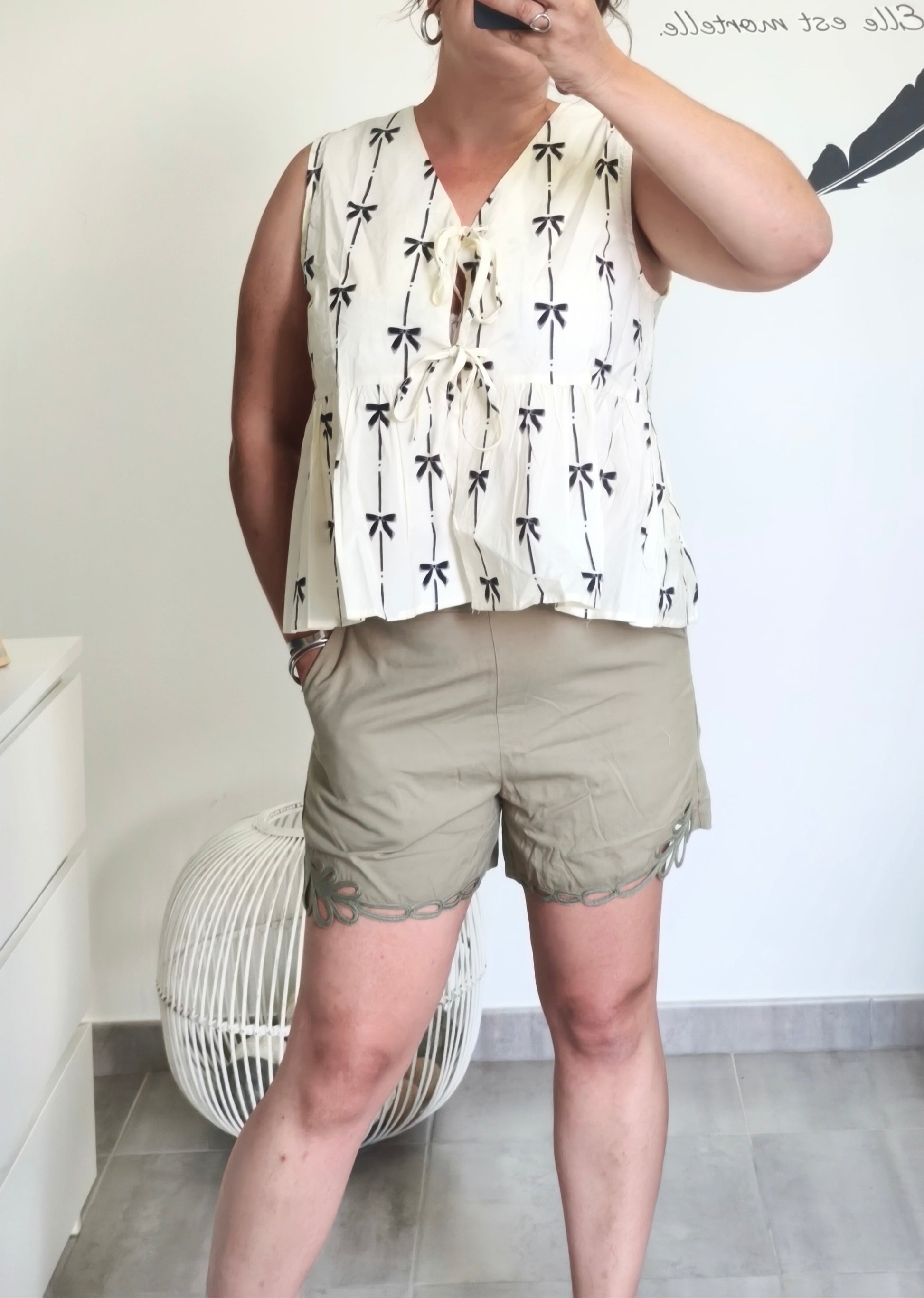 Cette blouse "Laly" est un incontournable pour votre garde-robe avec ses noeuds à la mode et son tissu 100% coton. Ajoutez une touche de style et de confort à votre look grâce à cette blouse tendance.