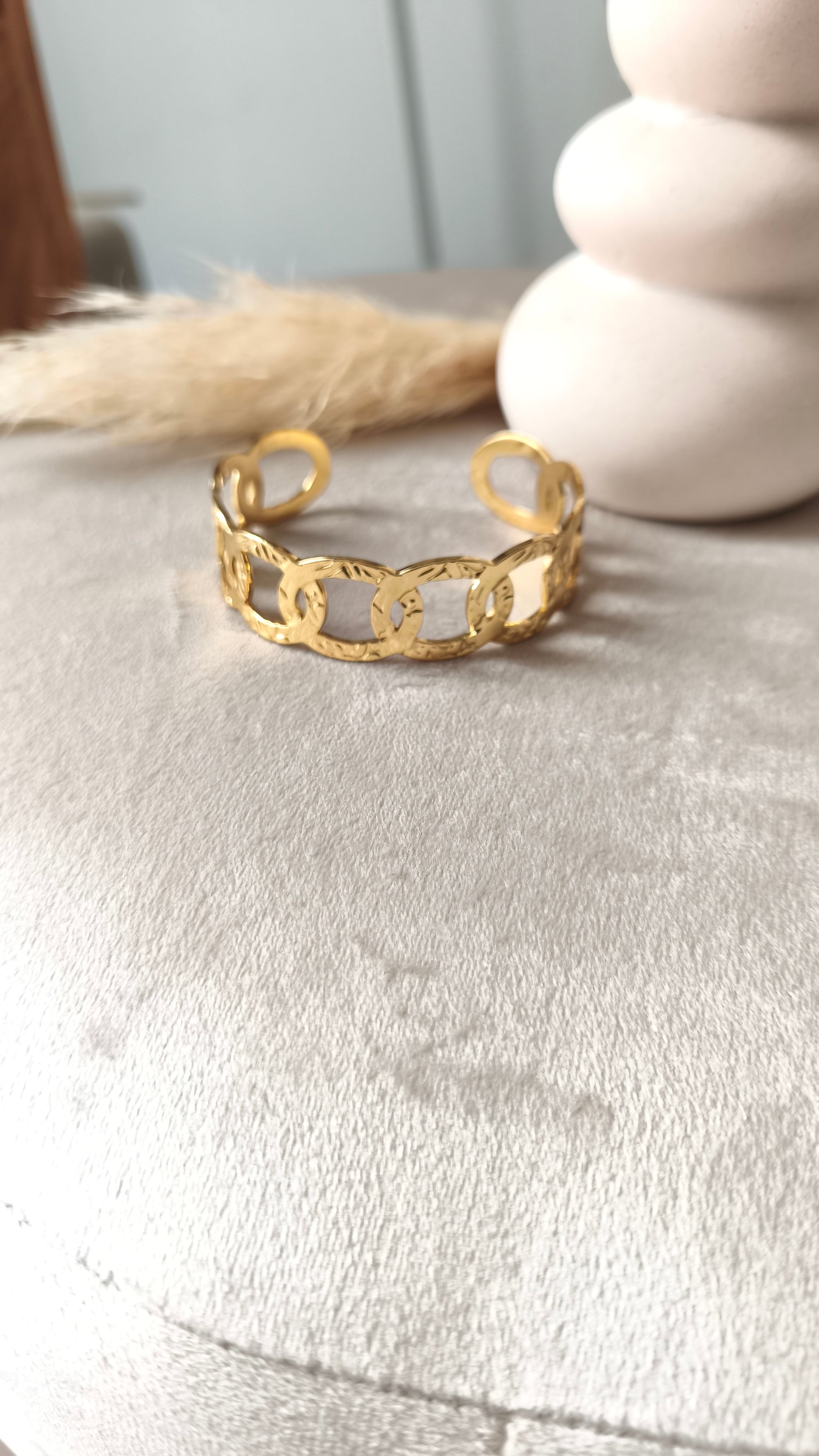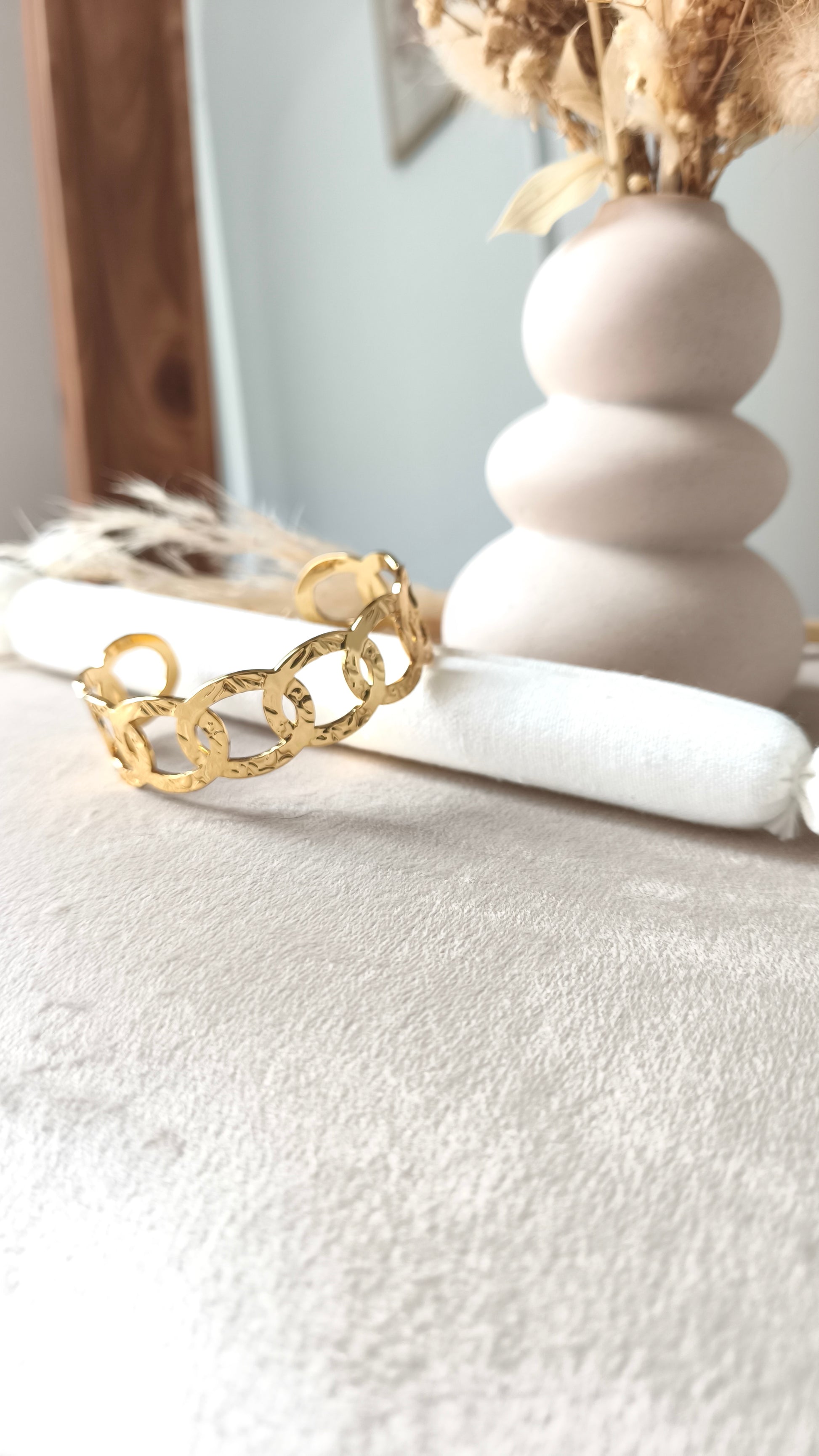 Découvrez la manchette "Sasa", un bracelet jonc doré qui allie sophistication et légèreté. Ses maillons finement sculptés et entrelacés jouent avec la lumière, créant des reflets captivants à chaque geste. Confortable à porter au quotidien, il apporte cette touche d'élégance moderne qui transforme un simple poignet en accessoire de prestige. Que ce soit pour sublimer votre style de tous les jours ou pour briller lors d'une soirée, cette manchette incarne le raffinement intemporel.