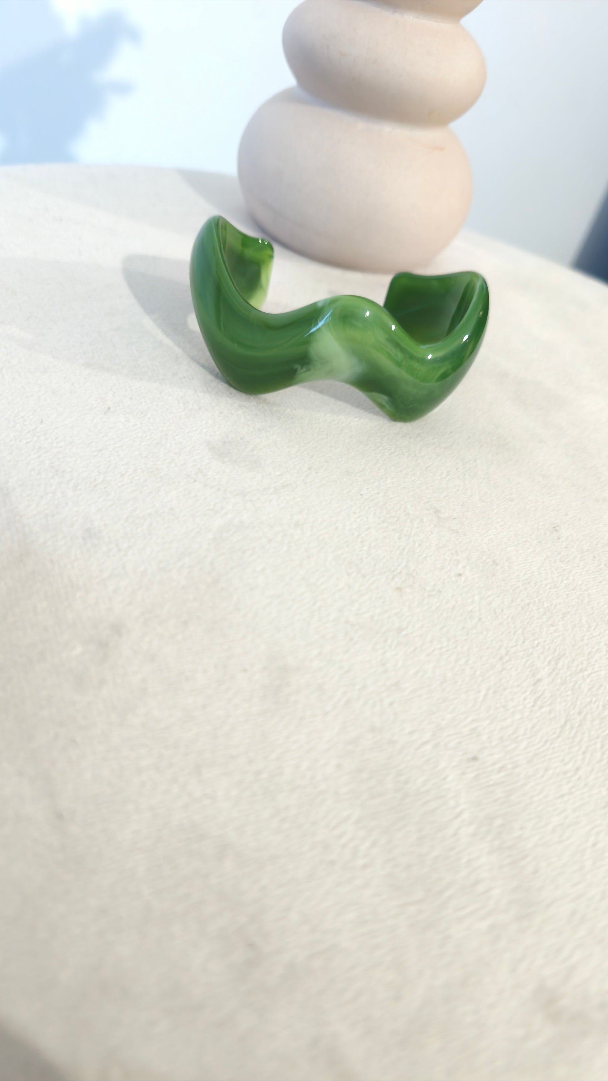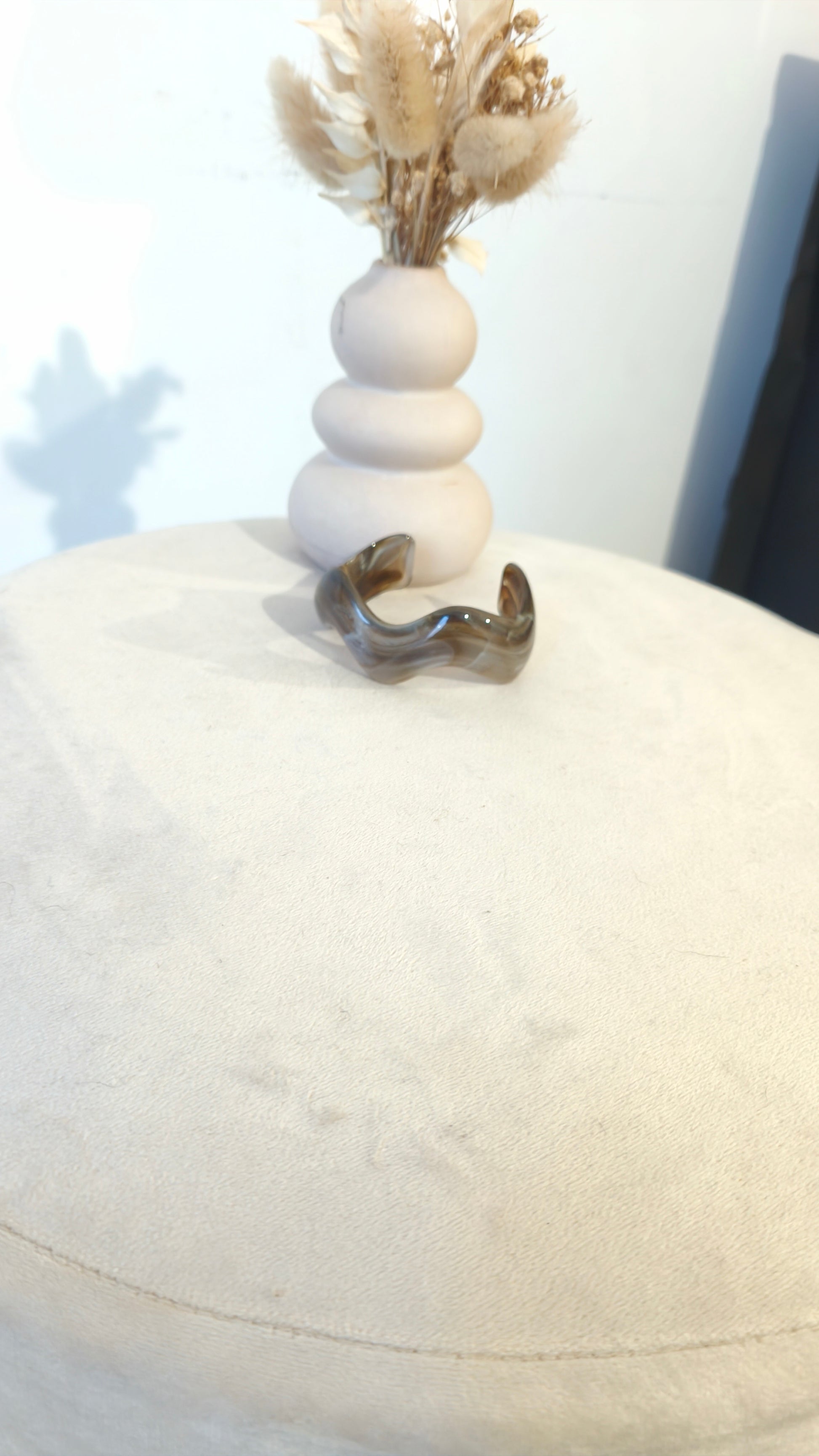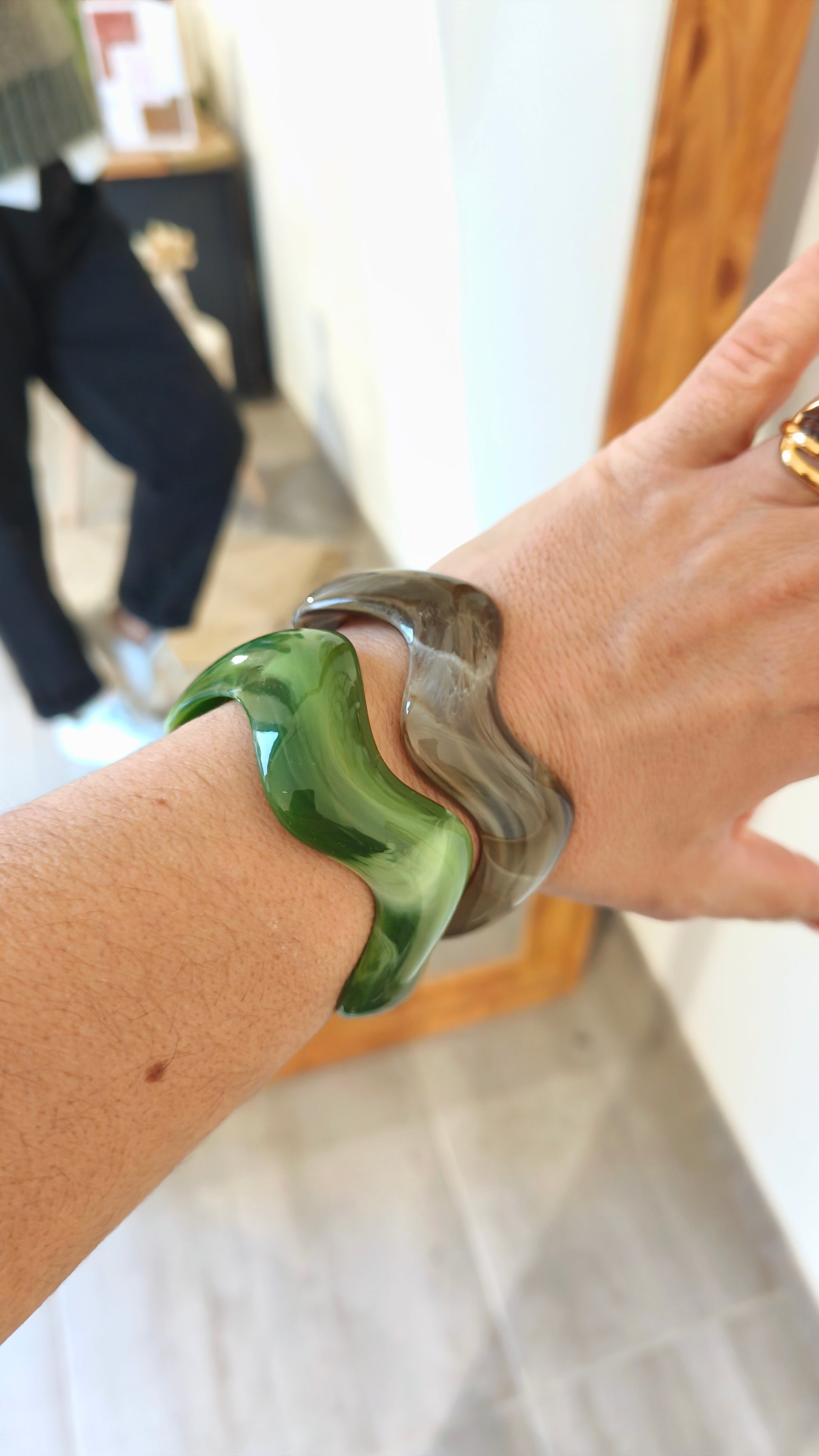 Ce jonc en résine "Émeline" apportera une touche de fraîcheur et une vague d'énergie à votre look. Disponible en vert ou taupe, son effet vague donnera un aspect unique et original à votre tenue. Parfait pour les personnes avec un esprit espiègle et aventureux.