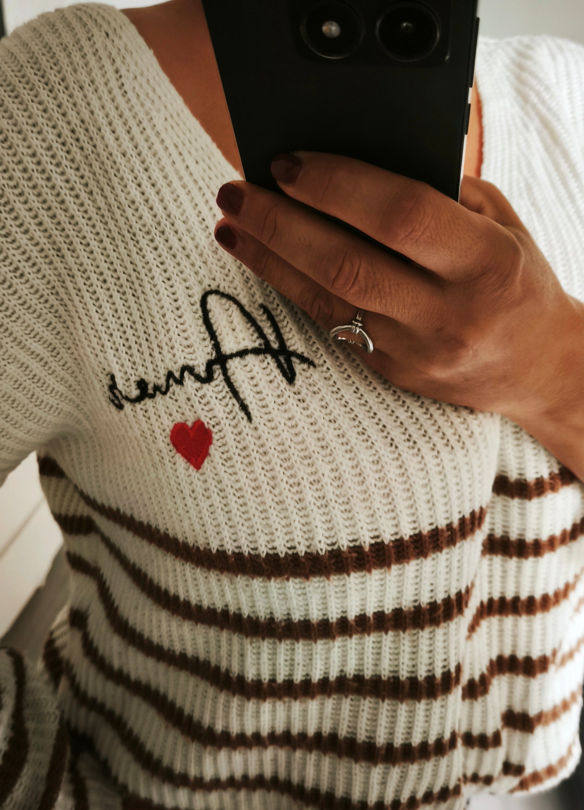 Le pull "Armelle" est le choix parfait pour les amateurs de confort et de style. Avec sa coupe taille unique adaptée jusqu'à un 44, il s'adapte à toutes les morphologies. Sa marinière blanche et camel ajoutera une touche élégante à votre tenue, tandis que ses détails de broderies "Amour" apportent une note romantique. Fabriqué avec 85% de polyamide et 15% de nylon, il offre à la fois douceur et résistance. Pour une longue durée de vie, nous vous conseillons de le laver à la main.