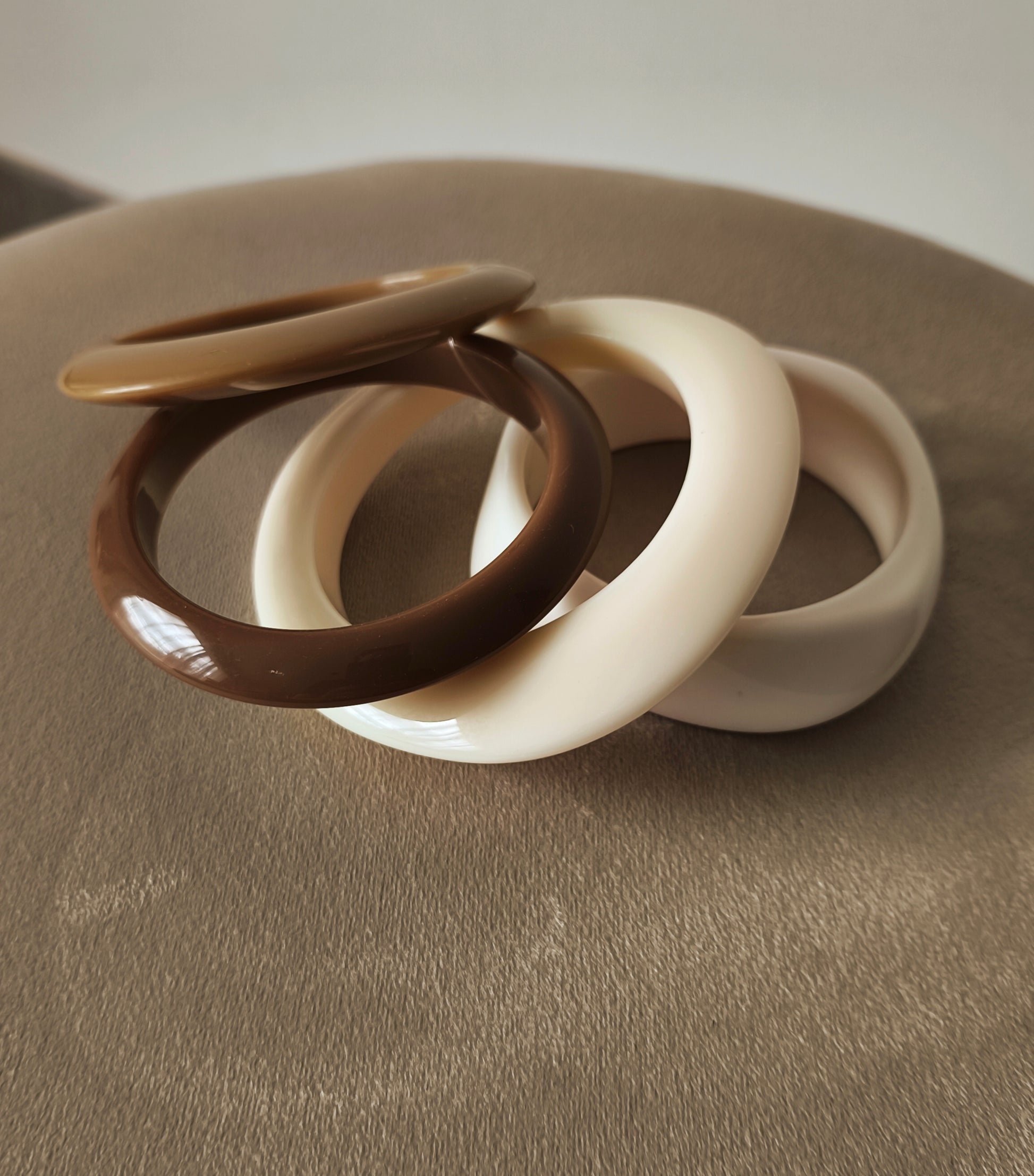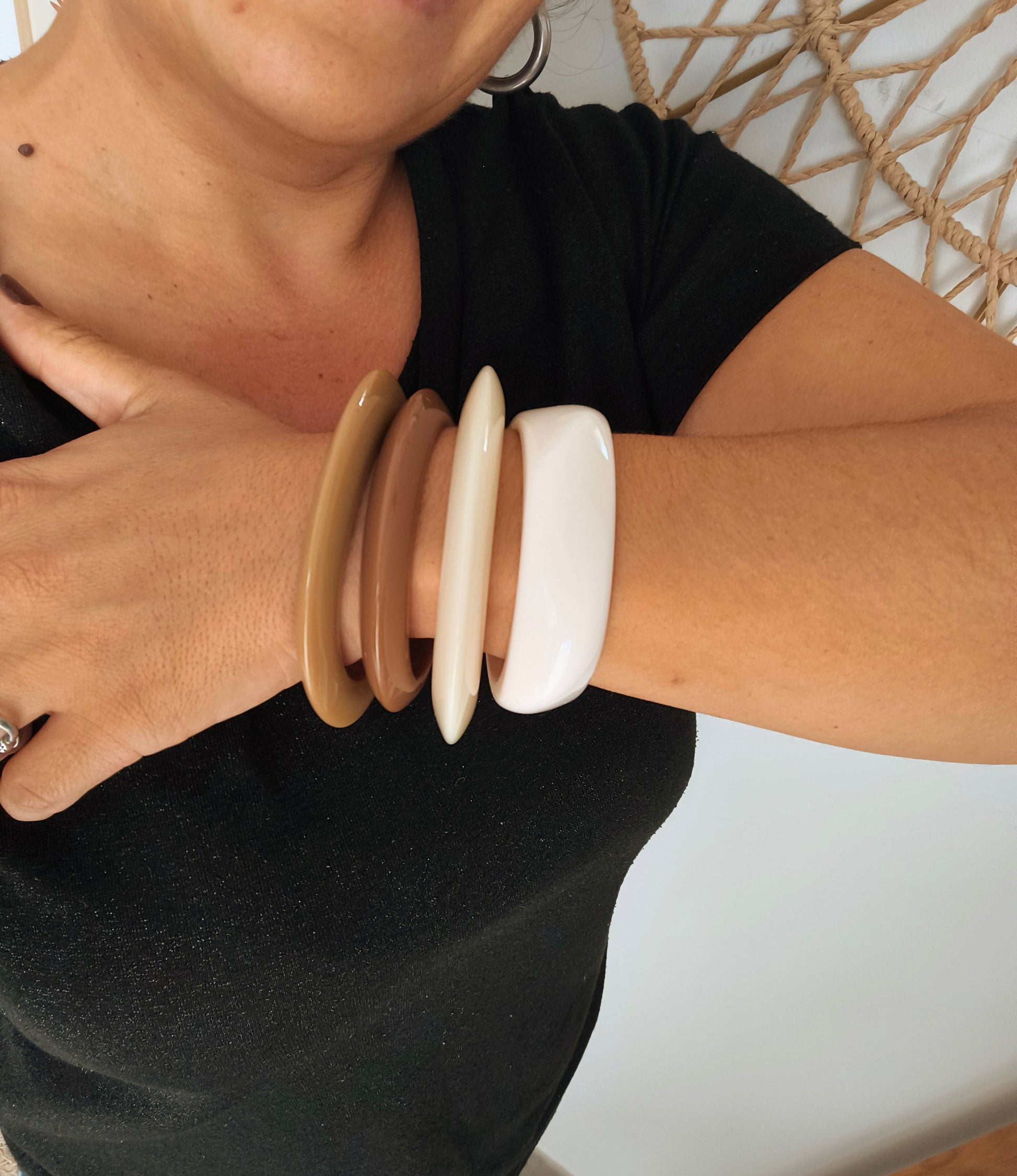 Ce lot de 4 bracelets jonc en résine apporte une touche moderne et élégante à vos looks. Avec leurs nuances dégradées allant du crème au brun, ils se portent ensemble pour un style affirmé ou séparément pour plus de subtilité. Légers et confortables, ces accessoires tendance complètent parfaitement vos tenues casual comme vos looks sophistiqués