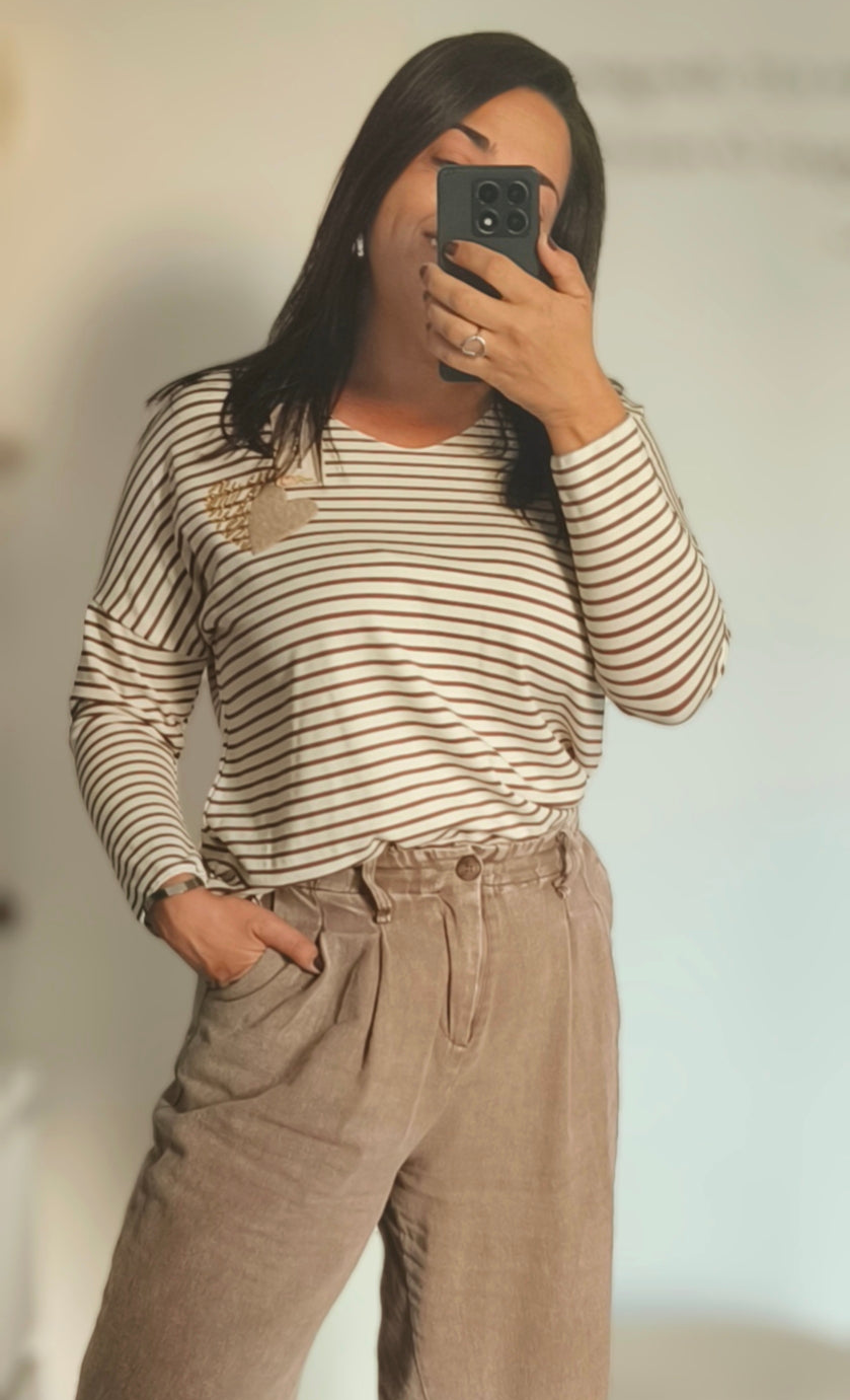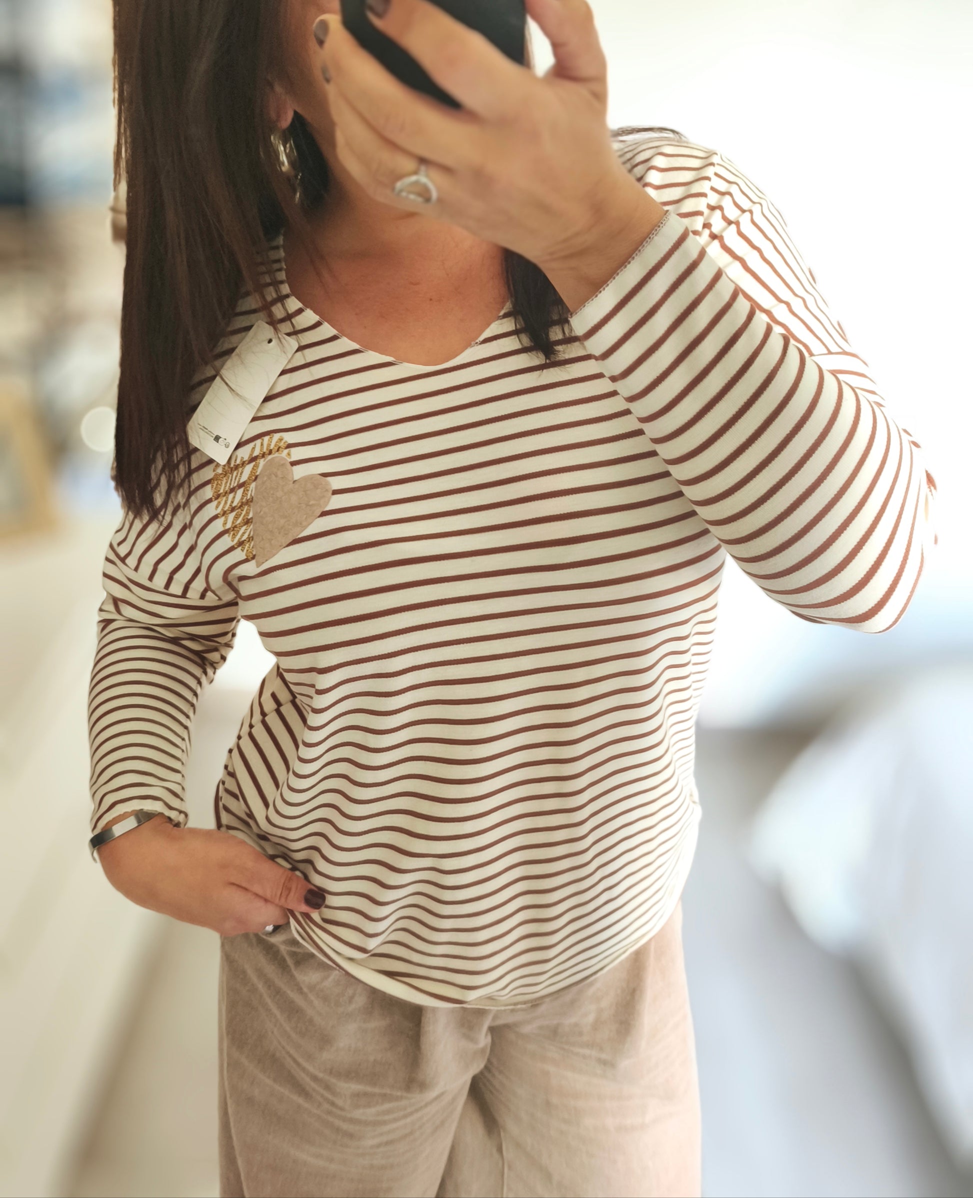 Découvrez notre "Lolo" top indémodable à la marinière terracotta et crème. La composition en coton, viscose et polyester assure un confort optimal pour toutes les tailles (36 à 44). Ajoutez une touche de style à votre garde-robe avec ce top "Lolo".